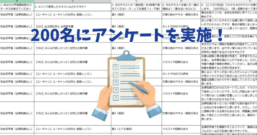 社労士独学者200名を対象に、利用したテキストおよび満足度(5段階)のアンケートを実施。