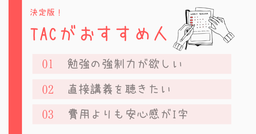 TACは「お金と時間を投資してでも、確実な環境とサポートを手に入れて自分を追い込みたい」という覚悟がある人に向いています。